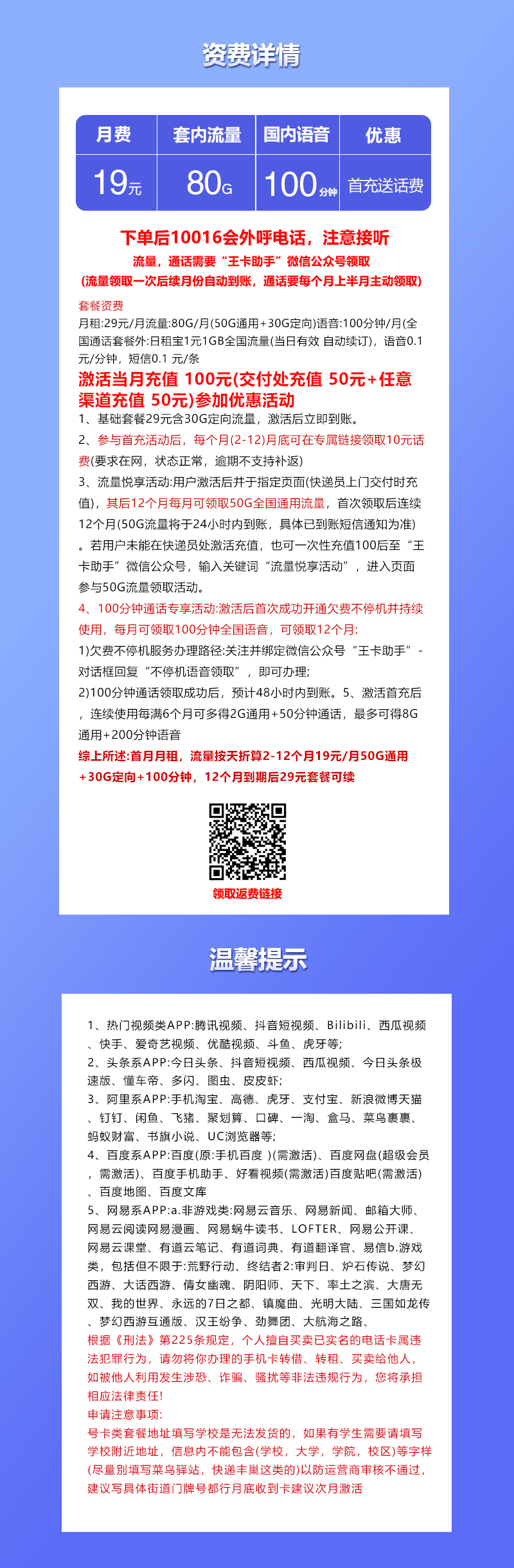 首月月租,流量按天折算2-12个月19元/月50G通用+30G定向+100分钟,12个月到期后29元套餐可续