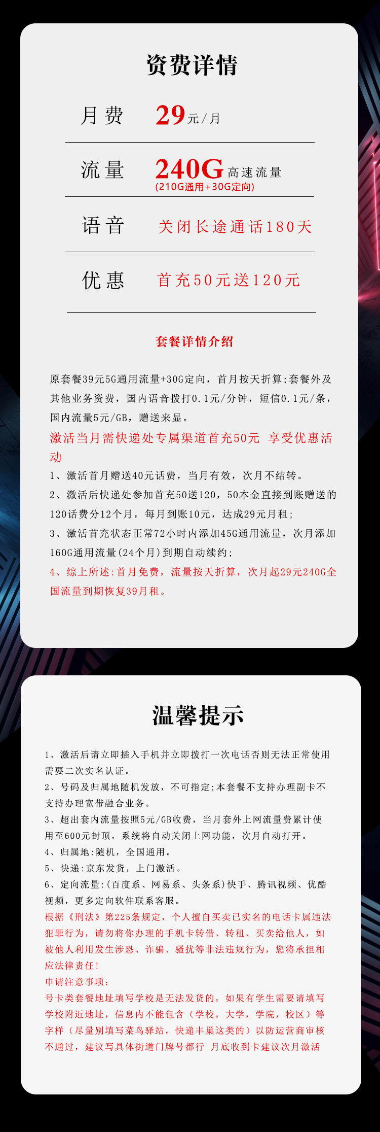 激活当月需快递处专属渠道首充50元 享受优惠活动