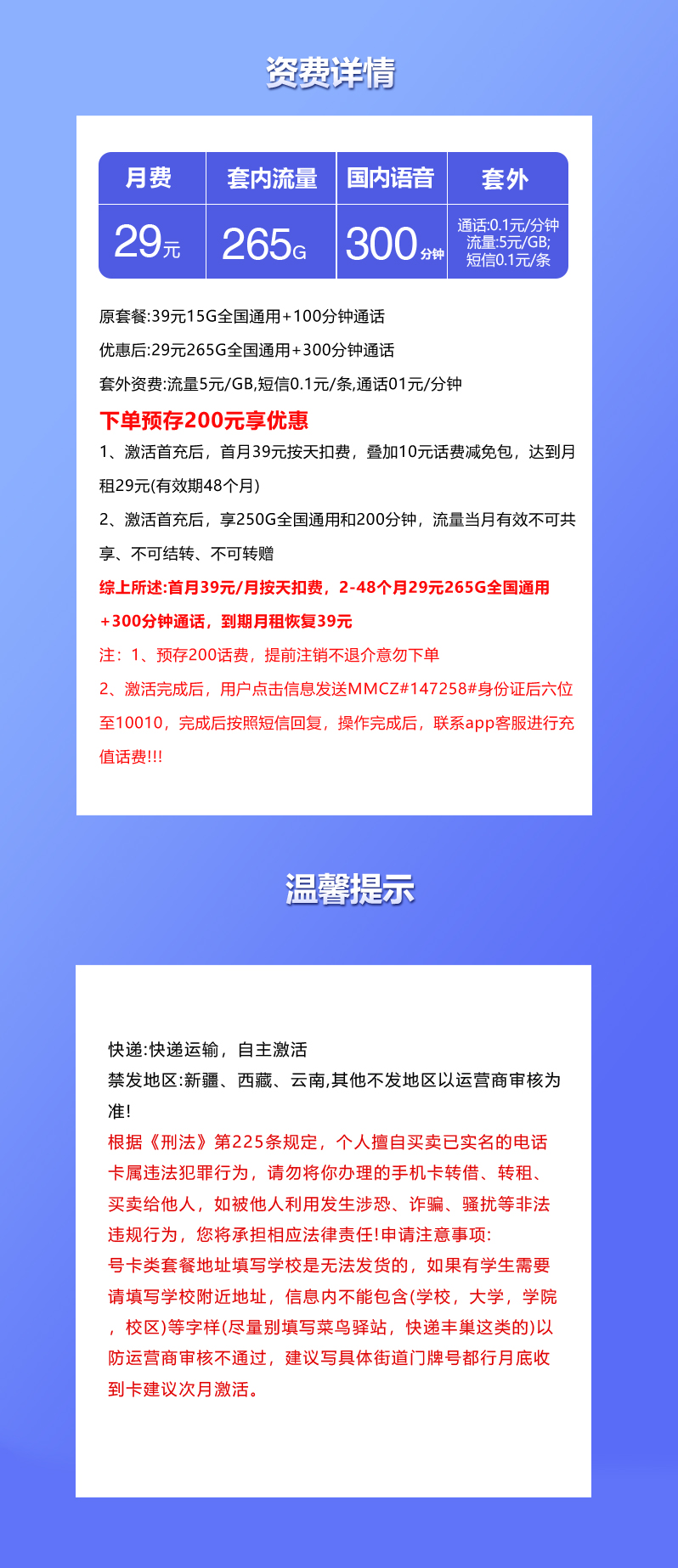 联通飞香卡:每月29元,包含265G流量和300分钟通话,性价比很高。