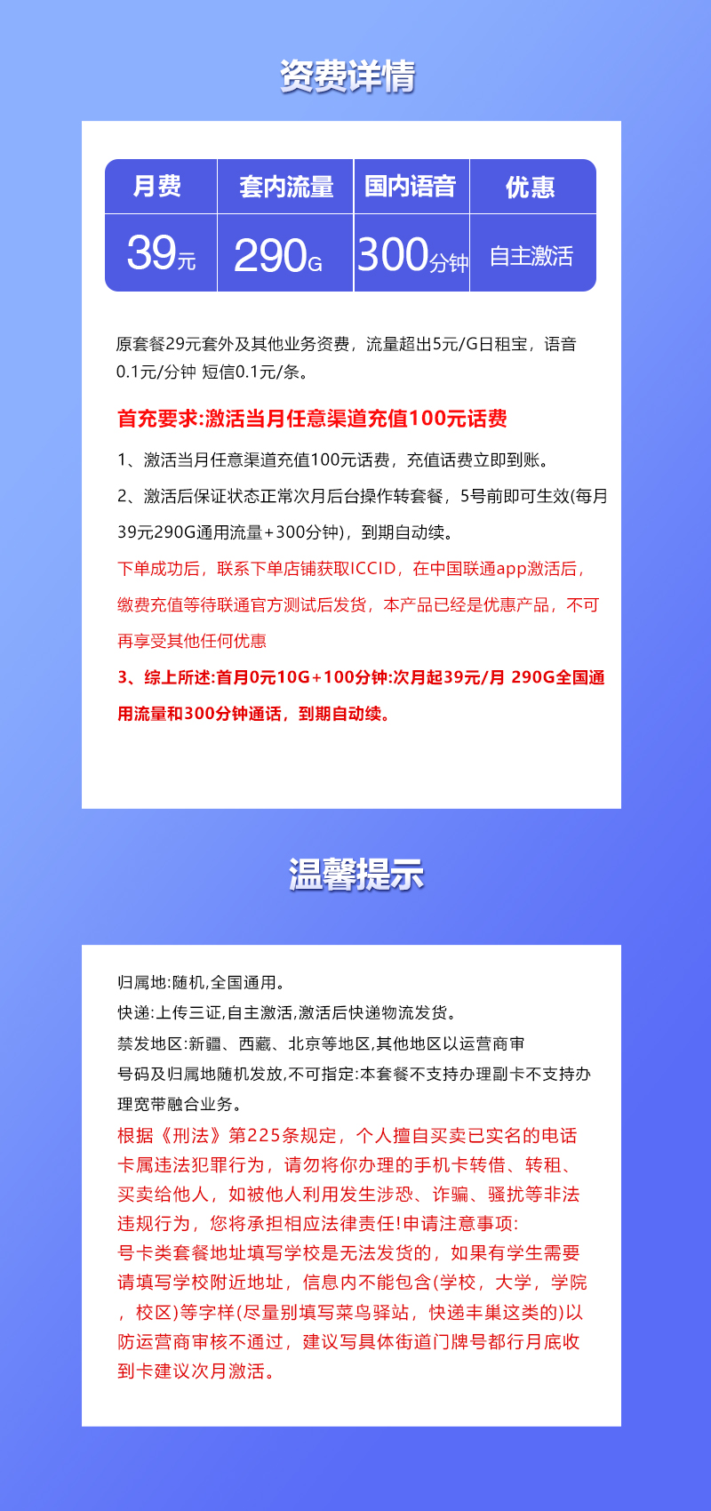 3、综上所述:首月0元10G+100分钟:次月起39元/月 290G全国通用流量和300分钟通话,到期自动续。