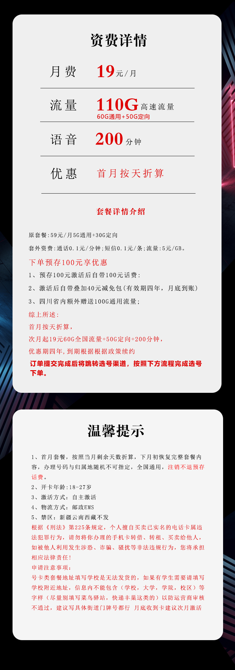 1、预存100元激活后自带100元话费:2、激活后自带叠加40元减免包(有效期四年,月底到账)