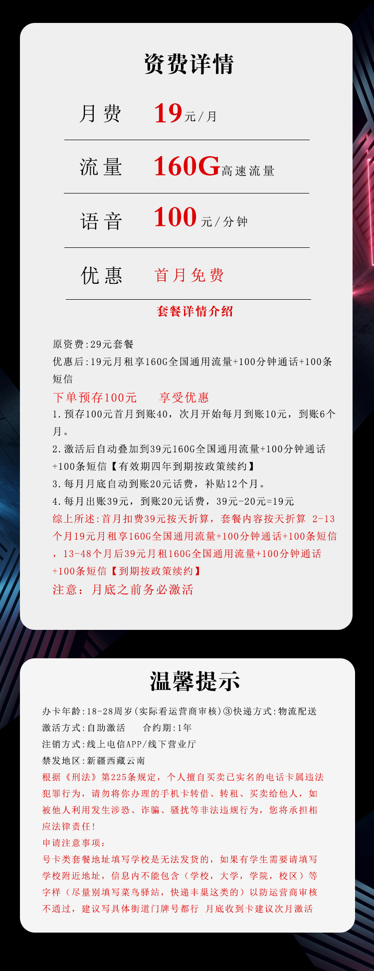 优惠后:19元月租享160G全国通用流量+100分钟通话+100条短信
