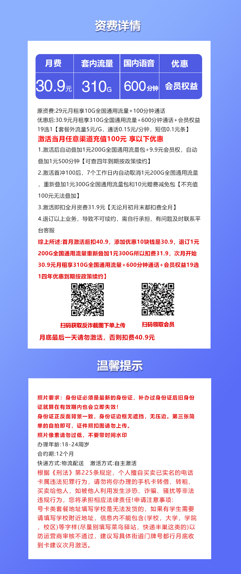 优惠后:30.9元月租享310G全国通用流量+600分钟通话+会员权益