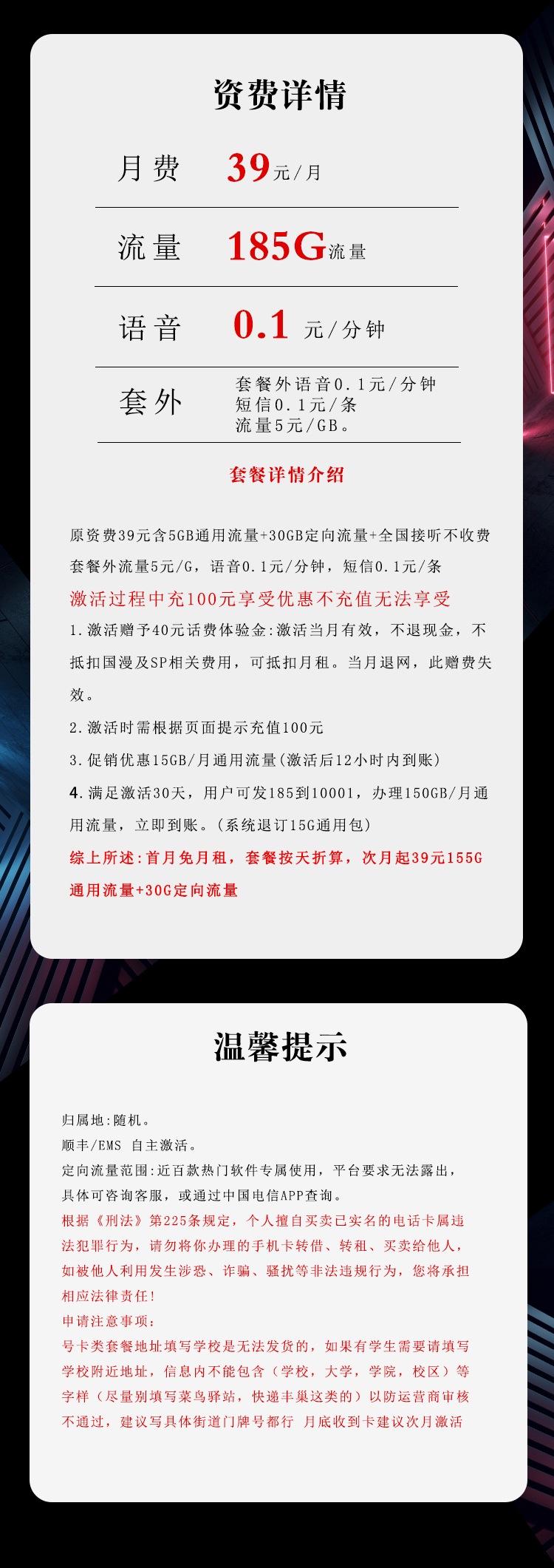 综上所述:首月免月租,套餐按天折算,次月起39元155G通用流量+30G定向流量